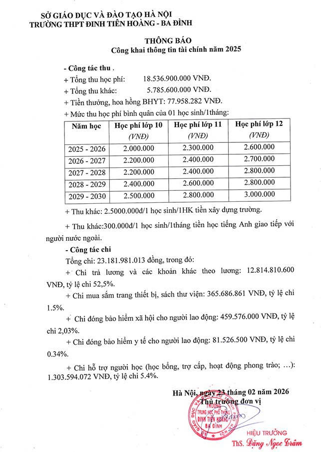Công khai thông tin tài chính năm 2025 và mức học phí hàng năm